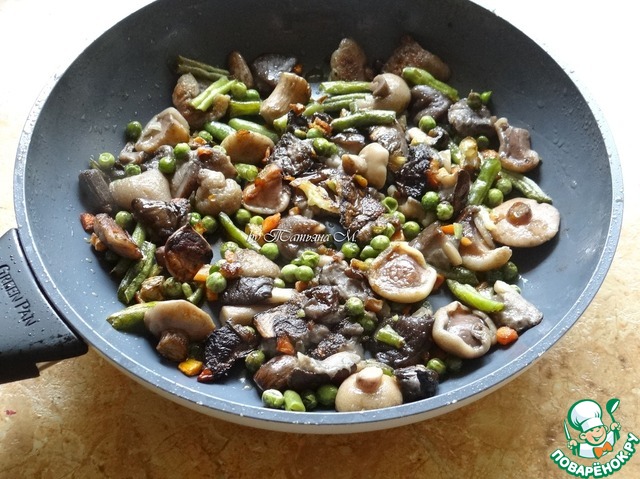 • Пока готовится индейка, в оливковом масле на сковороде поджарить грибы, морковь (кубиками), горошек и фасоль до легкой корочки, слегка подсолить;