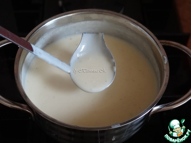 Влить молоко постепенно и при помешивании прогреть 10-12 минут;