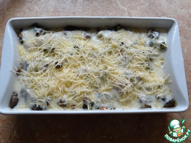 • С готовой индейки слить бульон, выложить к мясу грибную зажарку, залить соусом, посыпать тертым сыром;