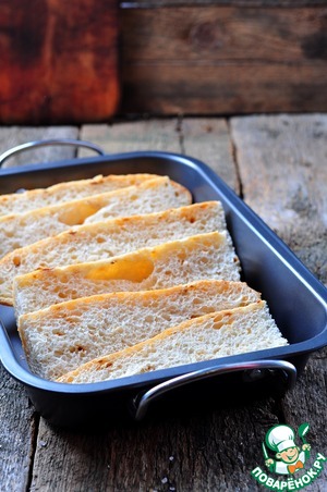 Черствый багет нарезать на куски размером формы для запекания.