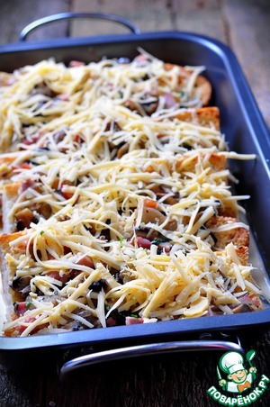 Залить сливочной массой багет, дать постоять пару минут чтобы низ багета размяк, посыпать тертым сыром. Запекать при 180* 20-25 минут.