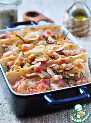 Pain perdu aux champignons de Paris, poireaux et jambon - очень вкусно:). Мягкая и нежная середка и чуть хрустящий верх. Приготовленное на основе черствого багета, лука и ветчины в сливочной заливке под корочкой расплавленного сыра.