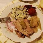 Полить соусом мясо и рис (мякоть яблока придаст густоту соусу).