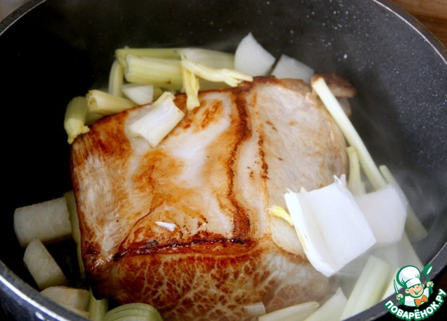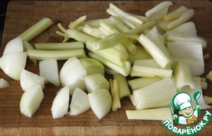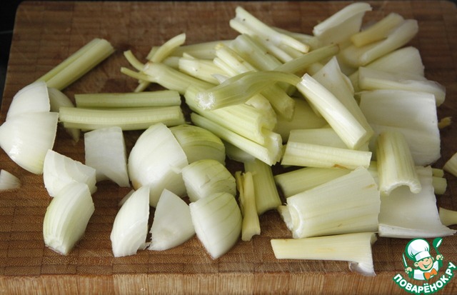 Нарезать крупно черешковый сельдерей и репчатый лук.