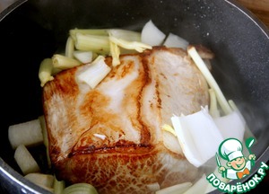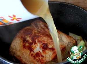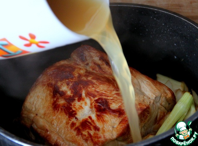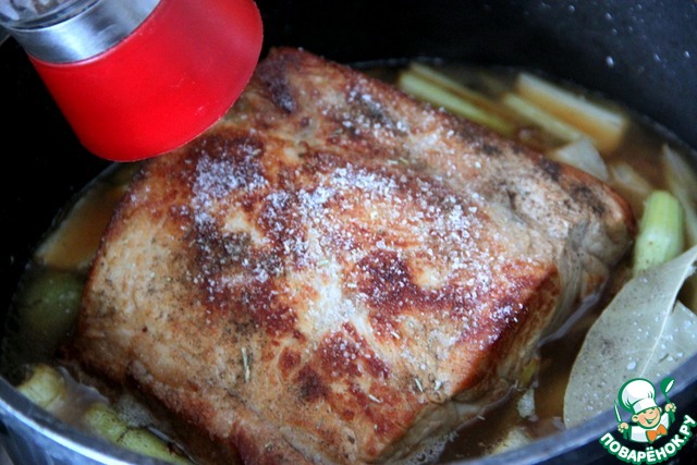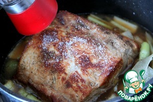 Затем мясо, овощи и соус хорошенько посолить и поперчить, добавить лавровый лист, закрыть крышкой (следите, чтобы посуда была без пластмассовых деталей!) или фольгой.