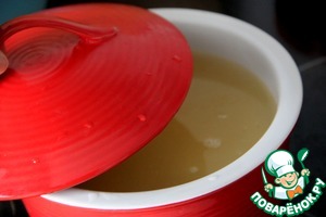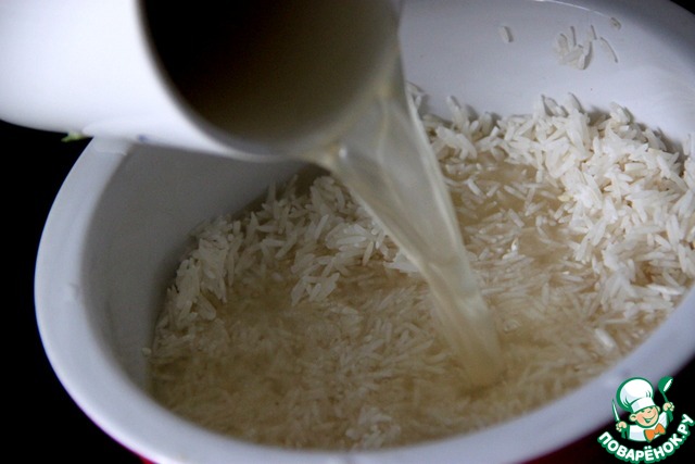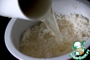 Кипящим бульоном (2 стакана) залить промытый рис (посуду можно использовать керамическую, для СВЧ или цельную форму для выпечки, накрыв фольгой)
