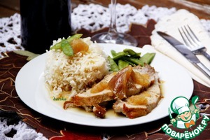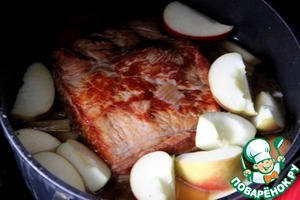Добавить яблочные дольки к мясу, мясо перевернуть. Продолжать все томить в духовке еще 25 мин., до готовности риса...