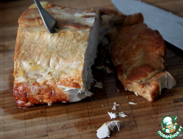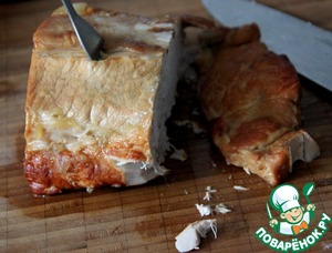 Нарезать мясо кусочками (на свое усмотрение, я люблю - вдоль, пластинами), оно настолько рассыпчатое, что нужно применять только острейший нож!