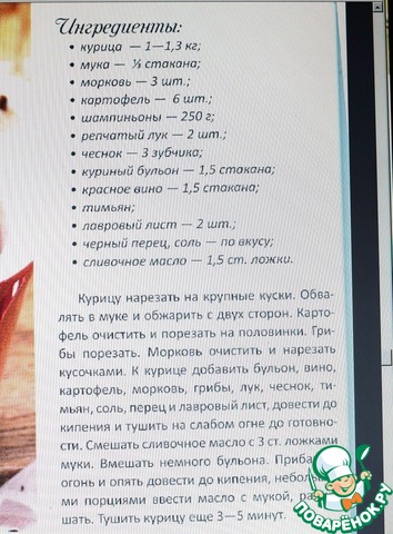 "Во Франции существует большое количество тушения куриного мяса в вине, в каждом регионе имеется как минимум один собственный рецепт. Однако считается, что родиной этого блюда является Бургундия, поэтому петух в вине по-бургундски считается классическим рецептом кок-о вен." Этот рецепт я готовила по книге "Французская кухня"
