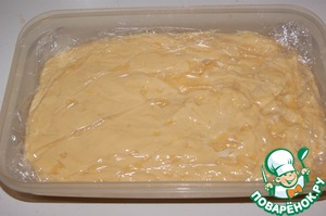Готовый крем поместить в просторную емкость и накрыть пищевой пленкой, которая должна приклеиться к его поверхности. Это необходимо для того, чтобы сверху не образовывалась обветренная корочка, и под пленкой не собирался конденсат. Крем полностью остудить при комнатной температуре.