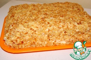Четвертый корж разломать и растереть руками в крупную крошку. Украсить ими верх и бока торта. Поместить его в холодильник. Застывший торт нарезать на порции острым ножом.