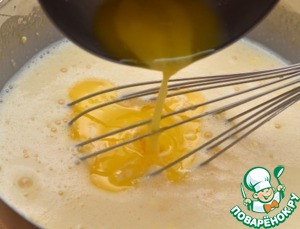 Сливочное масло растопить и влить в готовое тесто для блинчиков, размешать венчиком
