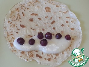 На теплый блинчик положить теплый соус "Бешамель" и несколько ягод вишни, свернуть рулетиком