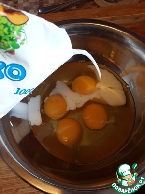 • К яйцам влить молоко, взбить венчиком, добавив щепотку соли. Всыпать муку и размешать венчиком до однородности
