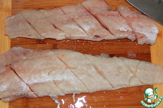 Если берем замороженное рыбное филе, то размораживаем его не до конца, так оно удобнее режется. Режем немного наискосок кусочками шириной 2-3 см., складываем в мисочку.