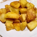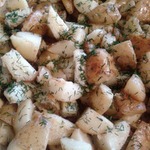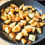 Возвращаем сотейник на сильный огонь, вливаем в него немного оливкового масла (с ним ароматнее, но вполне подойдет и другое растительное), выкладываем нашу картошку с чесноком туда же. Сверху на картошку раскидываем сливочное масло, это нужно для того чтобы у картошки был более нежный вкус, и получилась красивая плотная корочка. (Дж. Оливр добавлял ещё цедру половины лимона, снятую овощечисткой и клал чеснок прямо в очистках именно на этом этапе). Периодически перемешиваем картофель, не слишком впрочем усердствуя, если делать это слишком часто то мы долго будем дожидаться своей корочки.