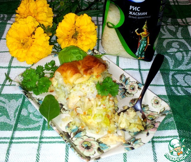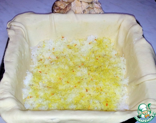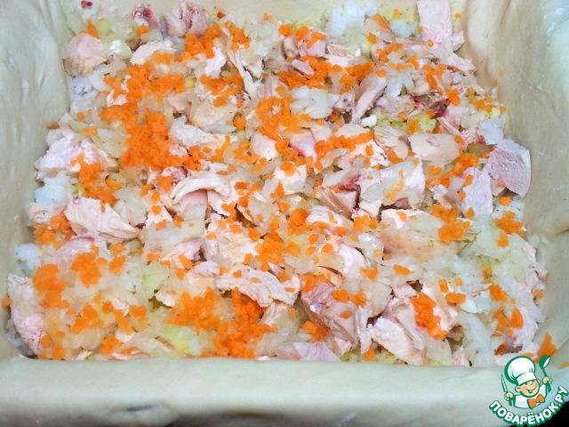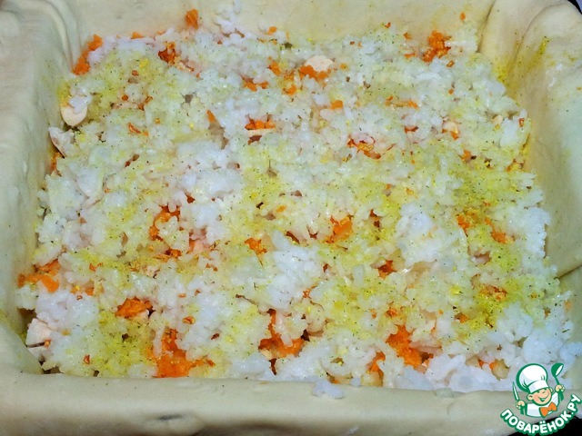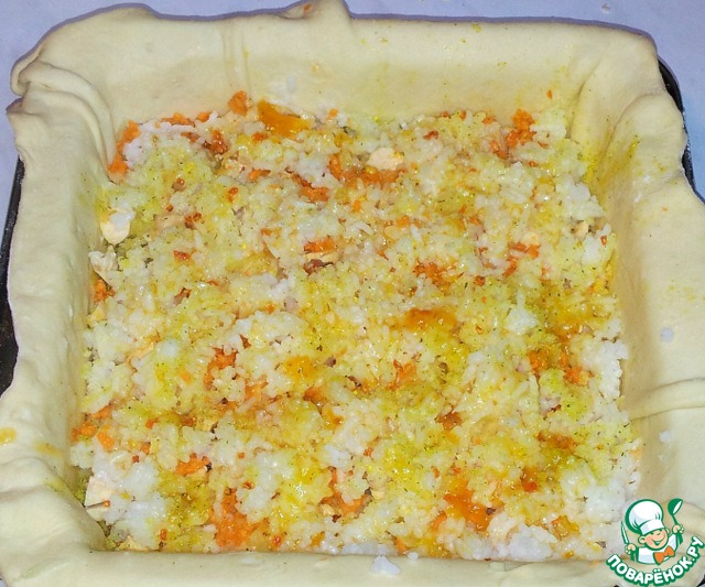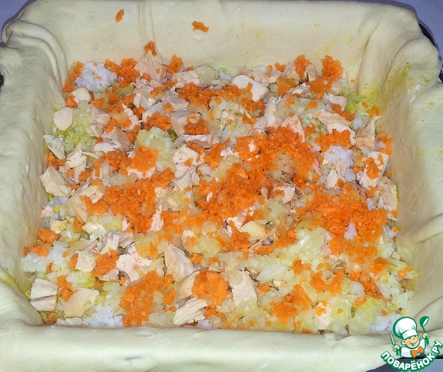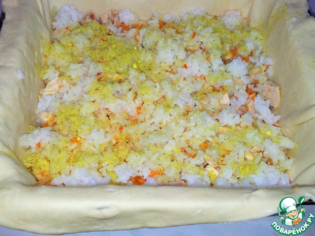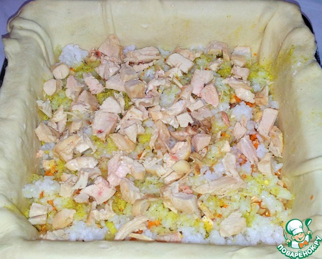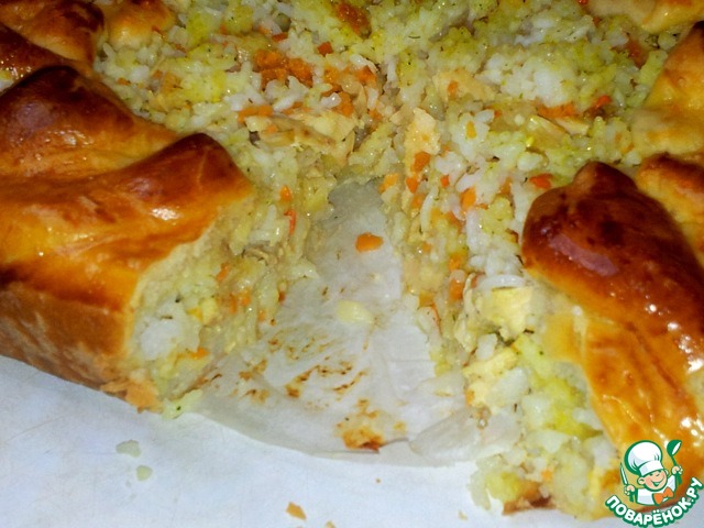 Рецепт «Пирог из дрожжевого слоёного теста с курицей и рисом»: