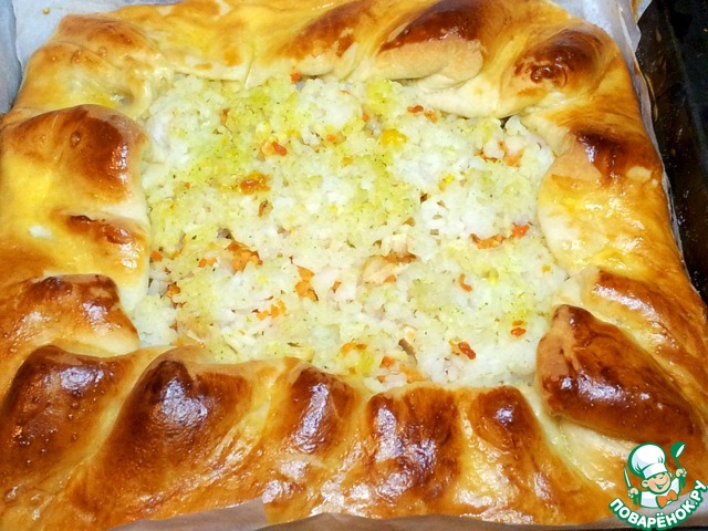 Пирог из дрожжевого слоёного теста с курицей и рисом