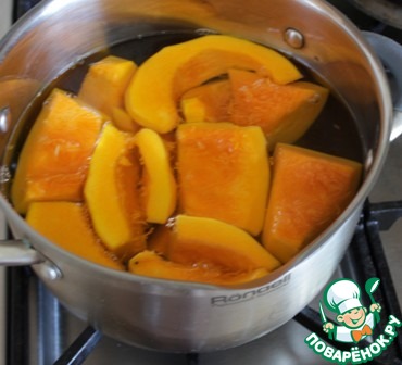 Налейте в кастрюлю воду, доведите до кипения, положите тыкву и отварите 10-15 минут, воду слейте.