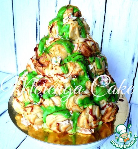 Второй слой профитроли обмакиваем в карамели, затем в крошке безе. Заполняем середину торта таким же образом придавая конусообразную форму