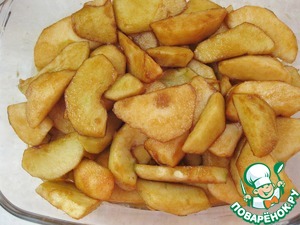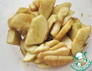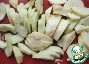 В общее время приготовления не включено время, затраченное на маринование яблок. Яблоки почистить от кожуры и сердцевины, нарезать ломтиками (не очень тонкими).