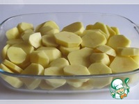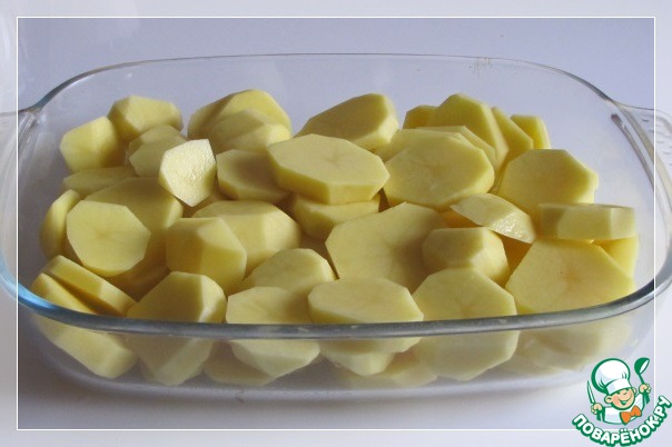 Картофель очистить, нарезать пластинками толщиной 5-7 мм, выложить в форму для запекания. |