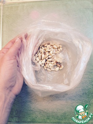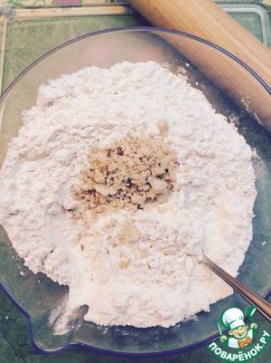 Смешиваем муку с цедрой, мускатным орехом и кедровыми, добавляем в муку соду. Все перемешиваем