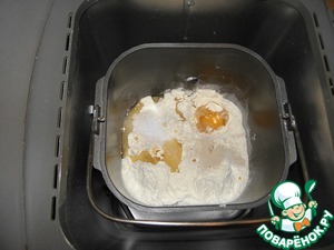 Замесить хорошо тесто. Я замешивала в ХП. ( поставила на функцию тесто, на 1,03) : Вылить теплую массу, затем яйцо, мука, соль, сахар, дрожжи, масло растительное.