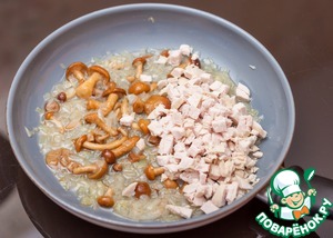 Как только грибы пустят сок, добавить филе индейки, нарезанное мелкими кубиками. Индейка пропитается грибными соками и станет сочной и ароматной. Посолить, поперчить и жарить до готовности грибов - примерно 10 минут.