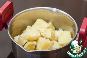 Картофель очистить и отварить в подсоленной воде. Слить воду, снять крышку с кастрюли и дать постоять 5 минут, чтобы вышел пар и картофель подсох
