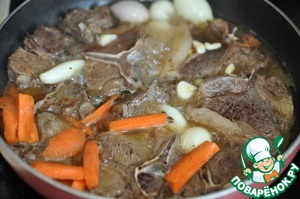 Добавляем к мясу вино и бульон, снова накрываем крышкой и тушим на слабом огне чуть больше часа.