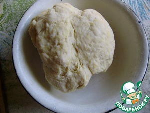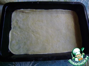 Тесто делим на 3 части. Раскатываем по всей площади формы. У меня форма примерно 15х23 см. Форму смазываем слегка растительным маслом и выкладываем первый слой теста.