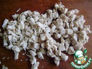 Отварное куриное мясо нарезаем мелкими кубиками.