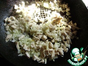 • Лук, чеснок и курицу обжариваем на растительном масле до золотистого цвета.
