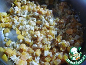 Тыкву нарезаем мелкими кубиками. Выкладываем в глубокую сковороду. Наливаем 2 ст. л. воды и тушим на медленном огне минут 7.