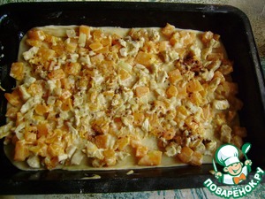 Сверху на тесто выкладываем половину начинки. Затем снова слой теста и начинки.
