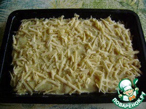Закрываем нашу "лазанью" третьим слоем теста и сверху присыпаем тертым сыром. Запекаем 30 минут в духовке при 200 градусах.