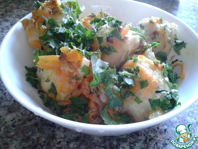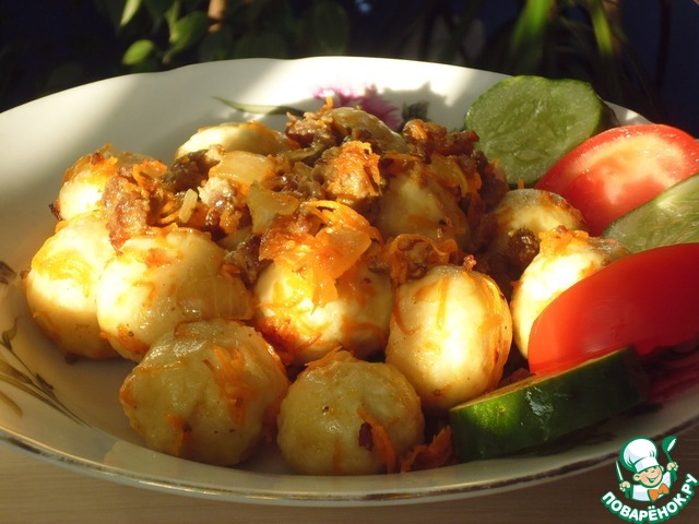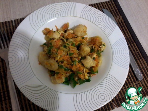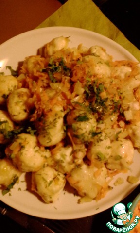 Галушки выкладываем в нашу зажарку и хорошо перемешиваем. Присыпаем зеленью. Приятного аппетита!