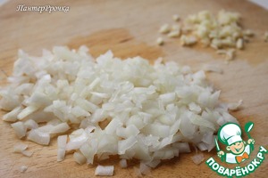 На среднем огне обжарить на оливковом масле лук в течение 30 секунд, добавить чеснок и готовить еще 30 секунд.