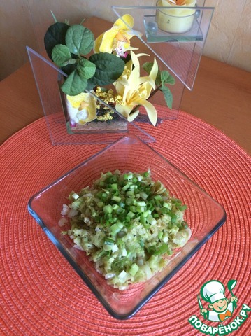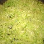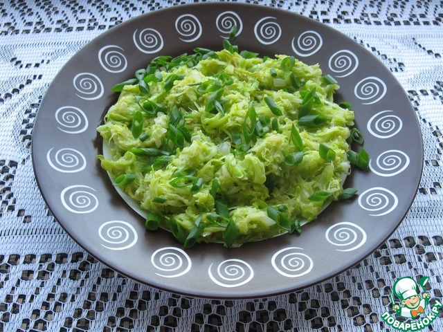 Немного увеличить огонь, добавить кабачок и готовить 5 минут при постоянном помешивании. Готовое блюдо посыпать нарезанным зеленым луком.