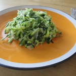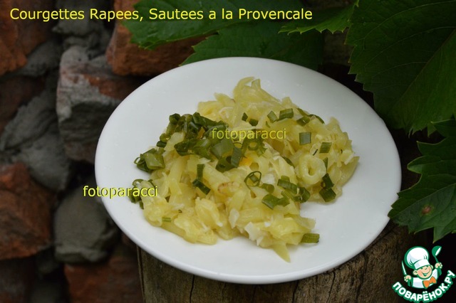 Courgettes Rapees, Sautees a la Provencale. Интересное, безумно вкусное блюдо с необычным (по крайней мере, для меня) способом приготовления кабачка. При этом кабачок получается очень сочным, нежным с пикантной ноткой. Блюдо чем-то по вкусу напоминает кабачковые оладьи, только гораздо более быстрый и простой вариант приготовления. Настоятельно рекомендую не откладывать рецепт в долгий ящик.