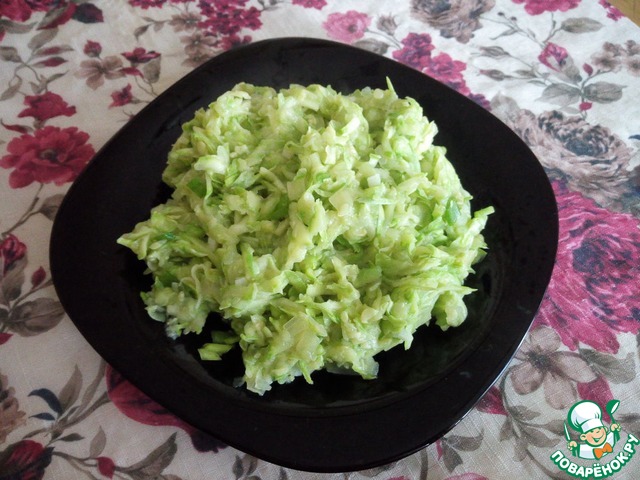 Кабачок помыть, срезать верхушку и кончик. Крупный плод разрезать пополам. Если кабачок старый, снять кожицу и убрать центральную часть. Натереть на крупной терке, переложить в дуршлаг, посыпать солью и тщательно перемешать. Соль нужно брать из расчета: 1 ч. л. на 450 г мякоти. Оставить на 5 минут, чтобы кабачок пустил сок. Так мы избавляемся от излишней влаги.