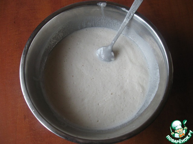 Сначала нужно в подогретом молоке развести дрожжи. Для этого в 0.5 л. тёплого (НО НЕ ГОРЯЧЕГО!!!) молока добавить 50 г. дрожжей, 2 ст. л. сахара и 2-3 ст. л. муки. Всё перемешать и оставить на 15 минут, чтобы дрожжи заработали.