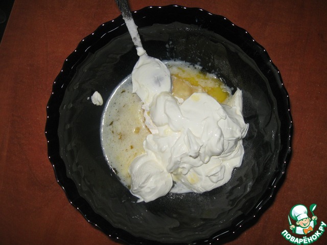 Тем временем готовим начинку. В миску выливаем сметану и добавляем к ней растопленное сливочное масло, сахар, муку, яичный белок (желток пригодится для смазки булочек) и ванилин. Всё хорошенько перемешиваем. Начинка готова.