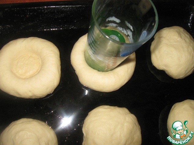 Кладём шарики из теста на смазанный растительным маслом противень. Каждый шарик надавливаем в центре дном стакана.