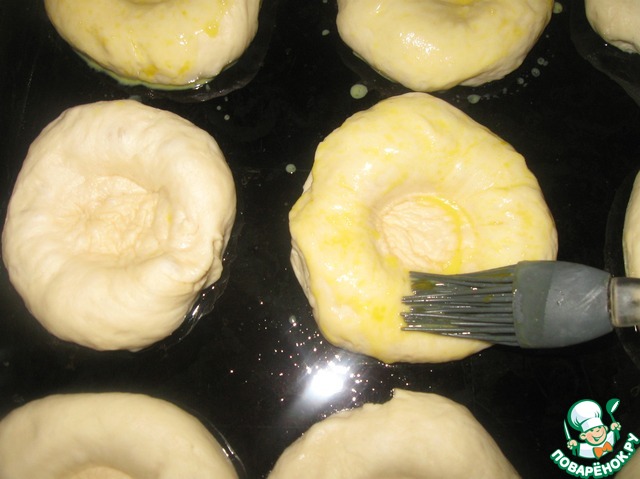 Каждую булочку смазываем смесью (желток + немного воды).