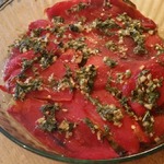 Мелко порубить чеснок и кинзу, добавить оливковое масло, бальзамический уксус, соль, перец, хорошо перемешать.