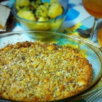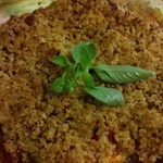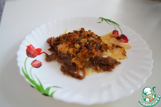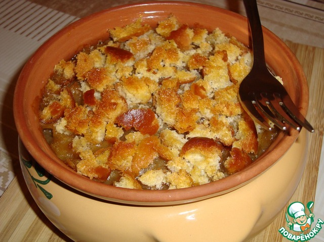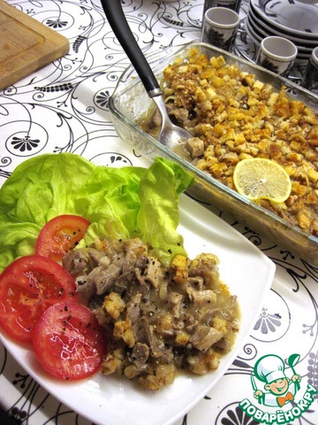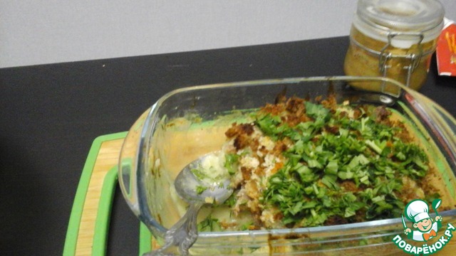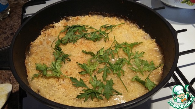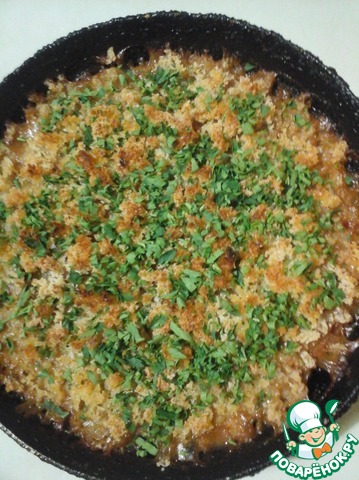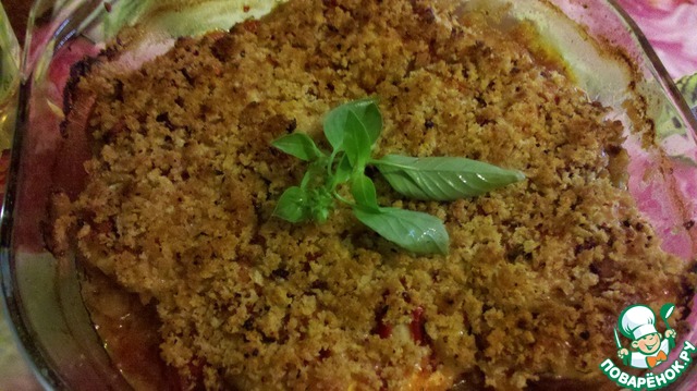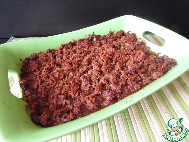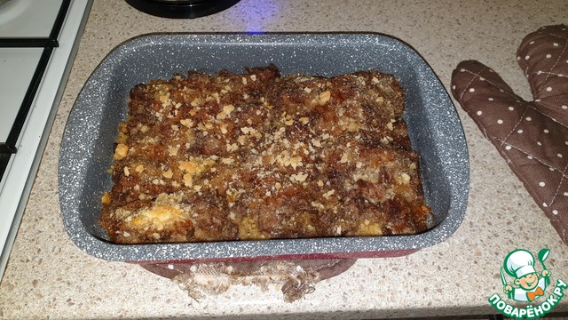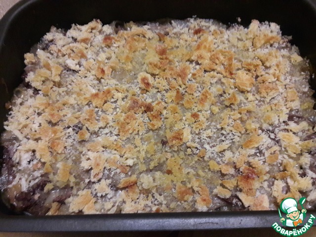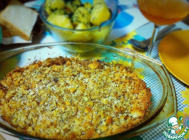 Сверху посыпаем хлебными крошками, у меня "серый" хлеб, поливаем оставшимся растопленным сливочным маслом и ставим в нагретую до 200 градусов духовку.