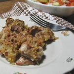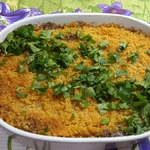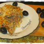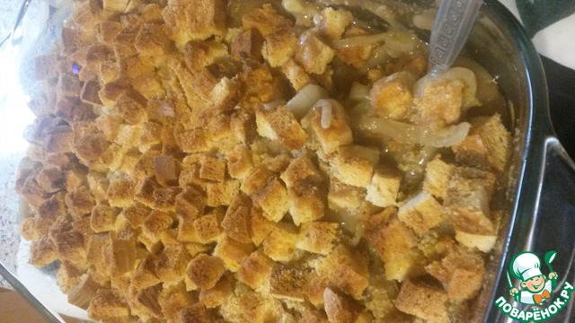 Берём удобную форму для запекания, кладём на дно половину тушёного лука.