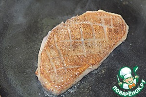 2. Утиную грудку вымыть, обсушить, сделать на коже надрезы, замариновать в смеси масла, соли и перца, оставить на 10-15 минут. Затем разогреть сковороду, выложить утку кожей вниз, обжарить с двух сторон до золотистой корочки. Затем довести в разогретой духовке до нужной прожарки.